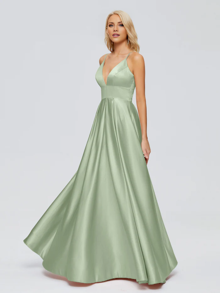 V-neck thin shoulder strap satin and floor length bridesmaid dress