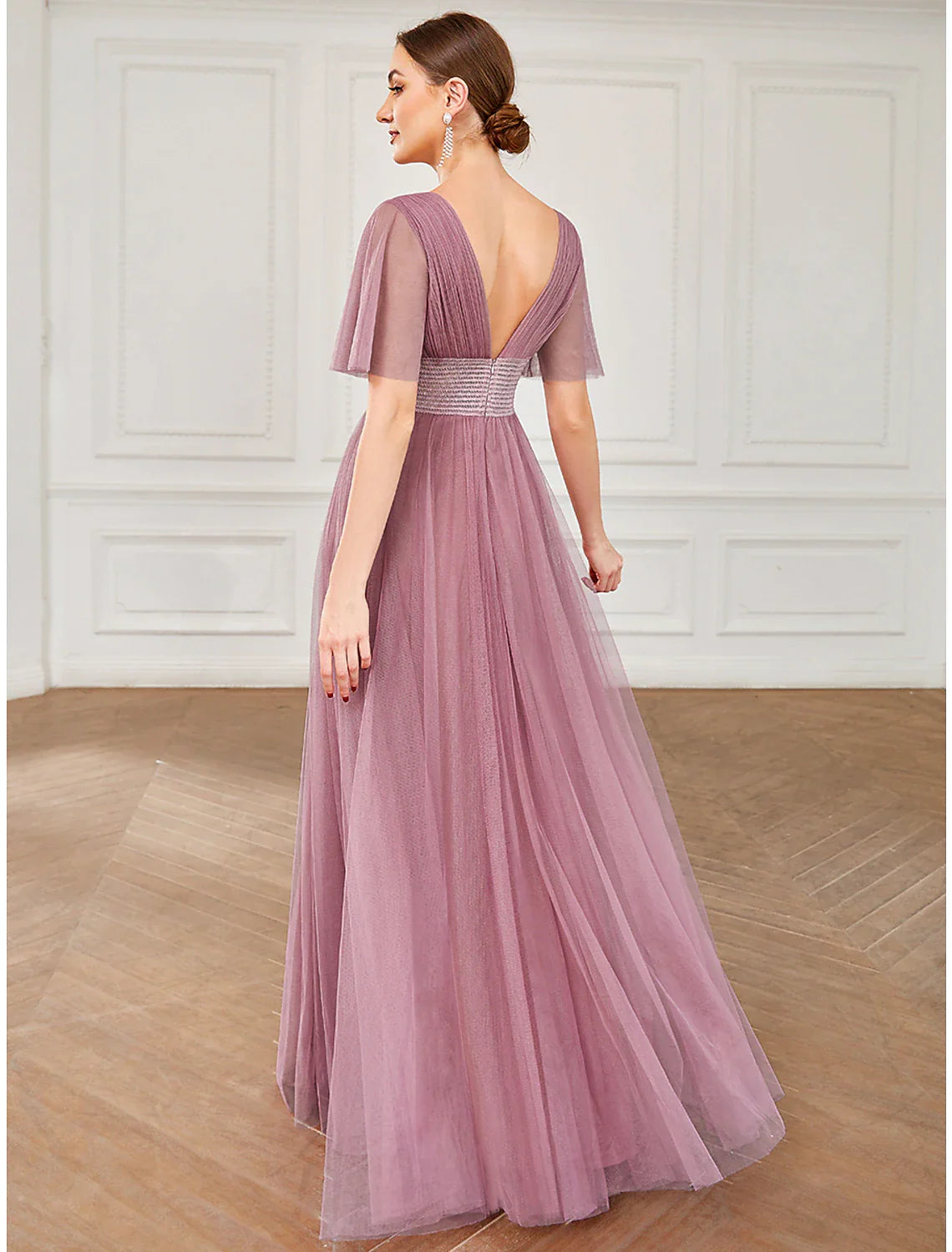 Weitese A-Line Bridesmaid Dress V Neck Short Sleeve Plus Size Floor Length Tulle with Ruffles